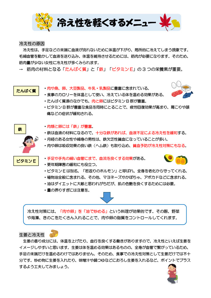 これからの時期、冷え性に悩む方もいらっしゃると思います。そこで今回は、冷え性対策のための食事についてお話しします。